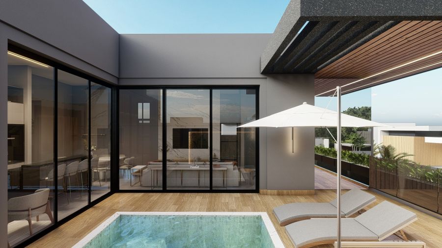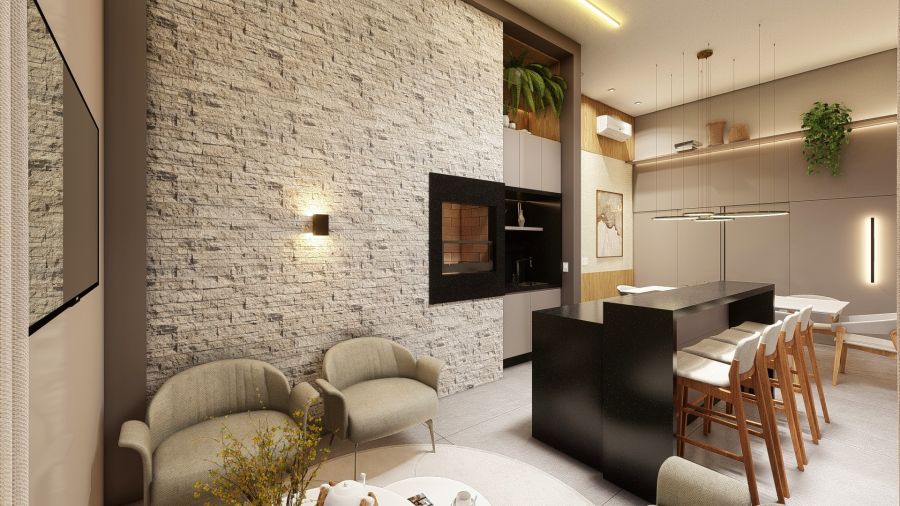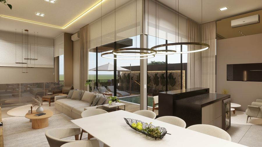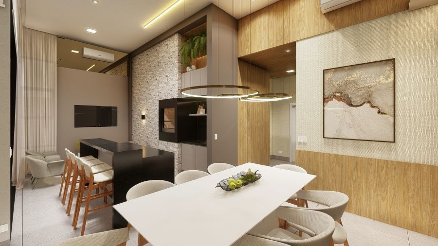 piscina, cozinha privativa, sala de jantar, sala de estar e sala de home.